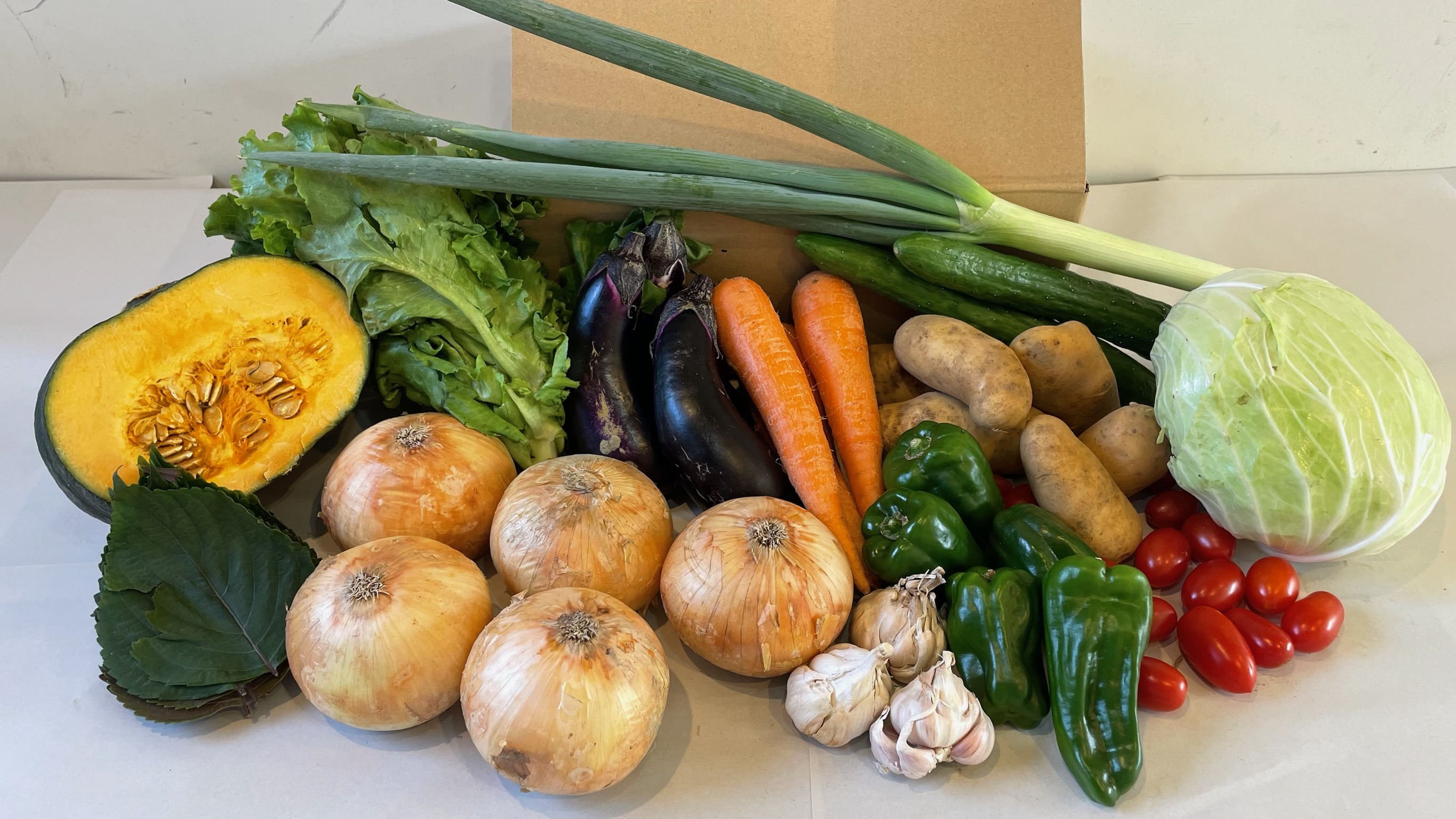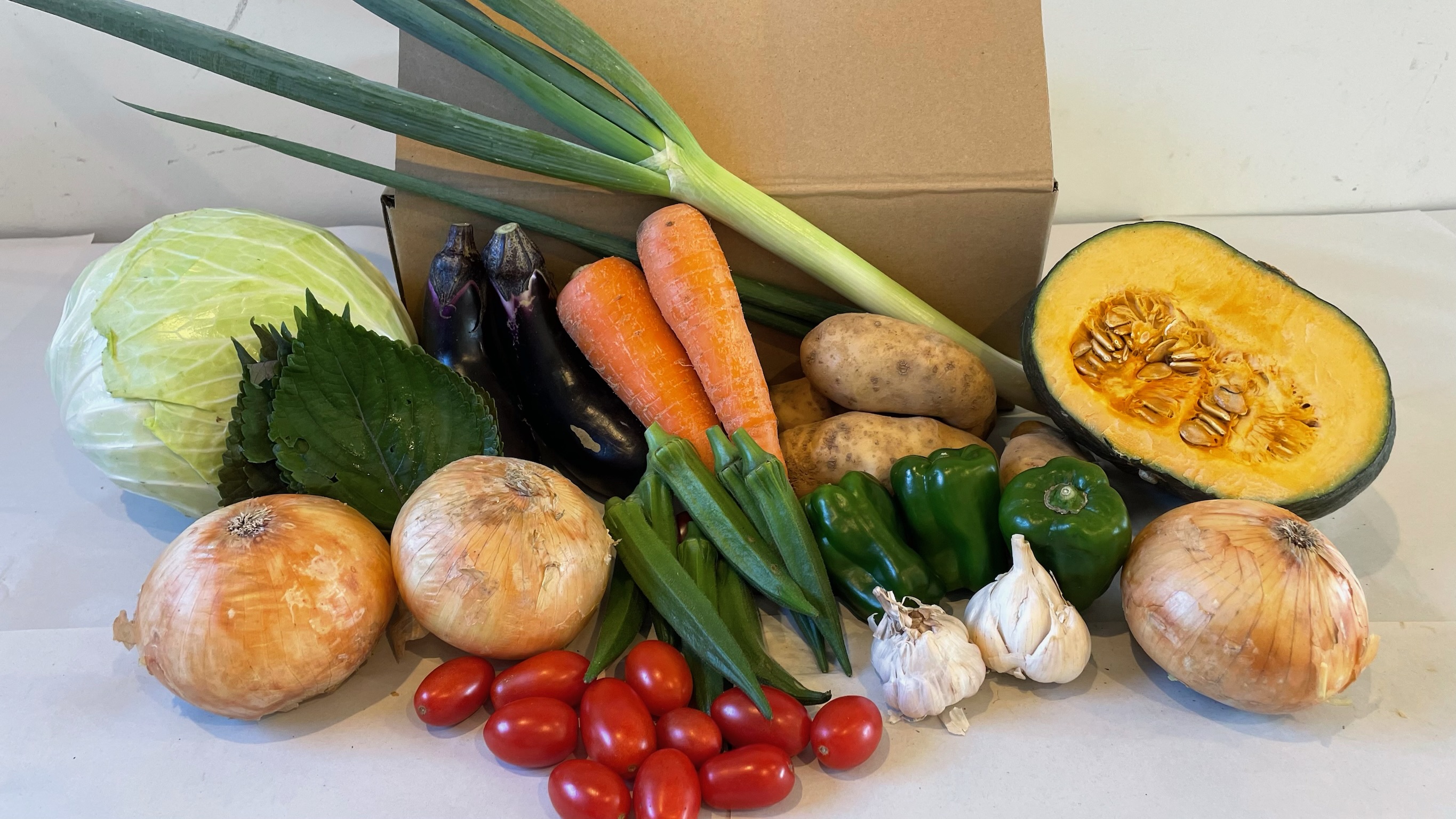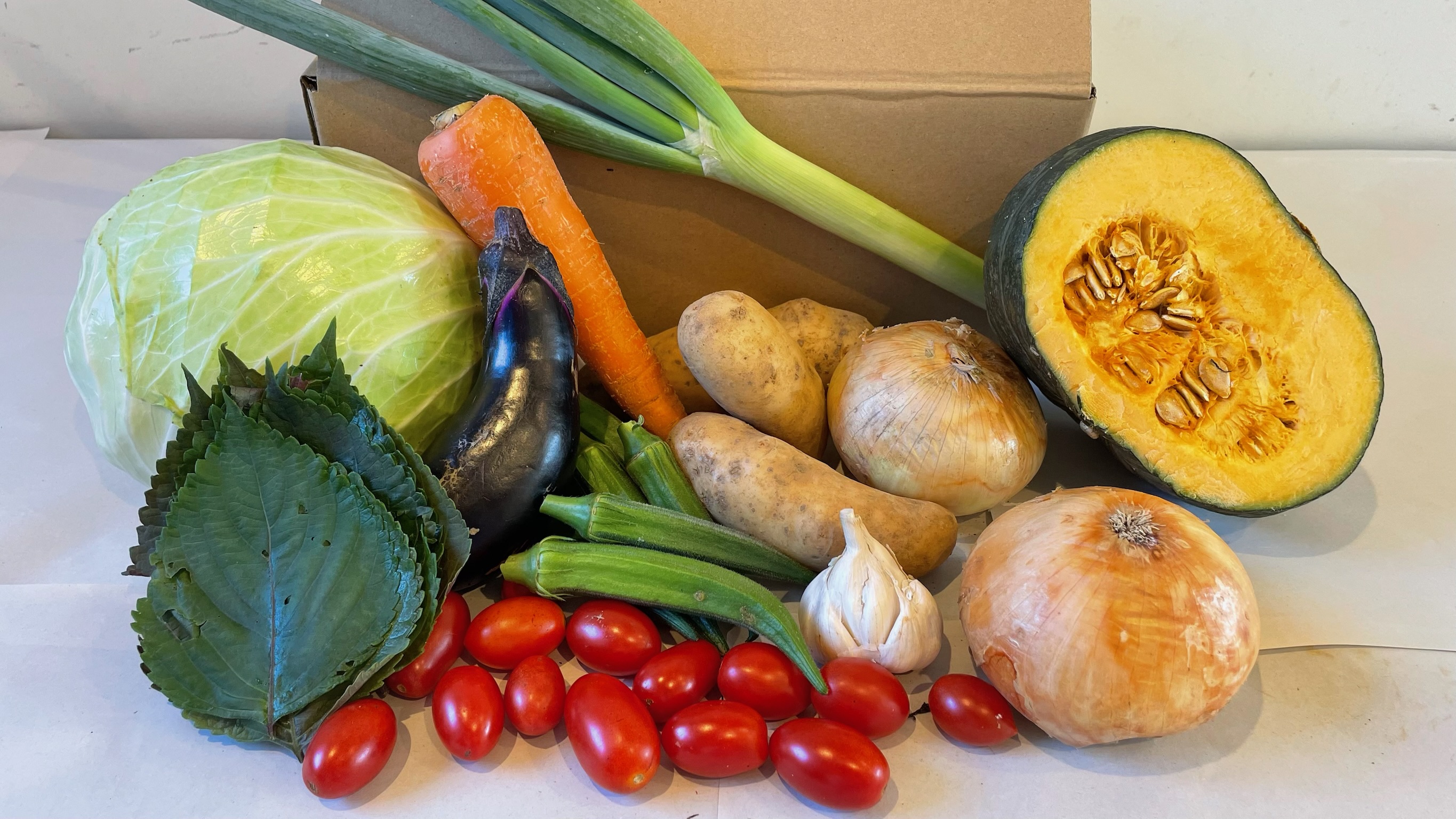 じゃがいも、玉ねぎ、オクラ、しめじ、ナス、ピーマン、きゅうり、キャベツ、大葉、カボチャ